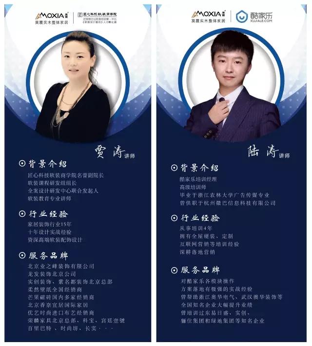 ? ??此次將以“3D在線家裝設計培訓”為主題,特邀匠心科技軟裝商學院名譽副院長、資深高端軟裝搭配設計師賈濤,中國頂尖家居裝修裝飾“酷家樂”培訓經理、高級培訓師陸濤以及莫霞實業專業技術人員為大家帶來一場精彩紛呈且含金量超高的培訓講解。
